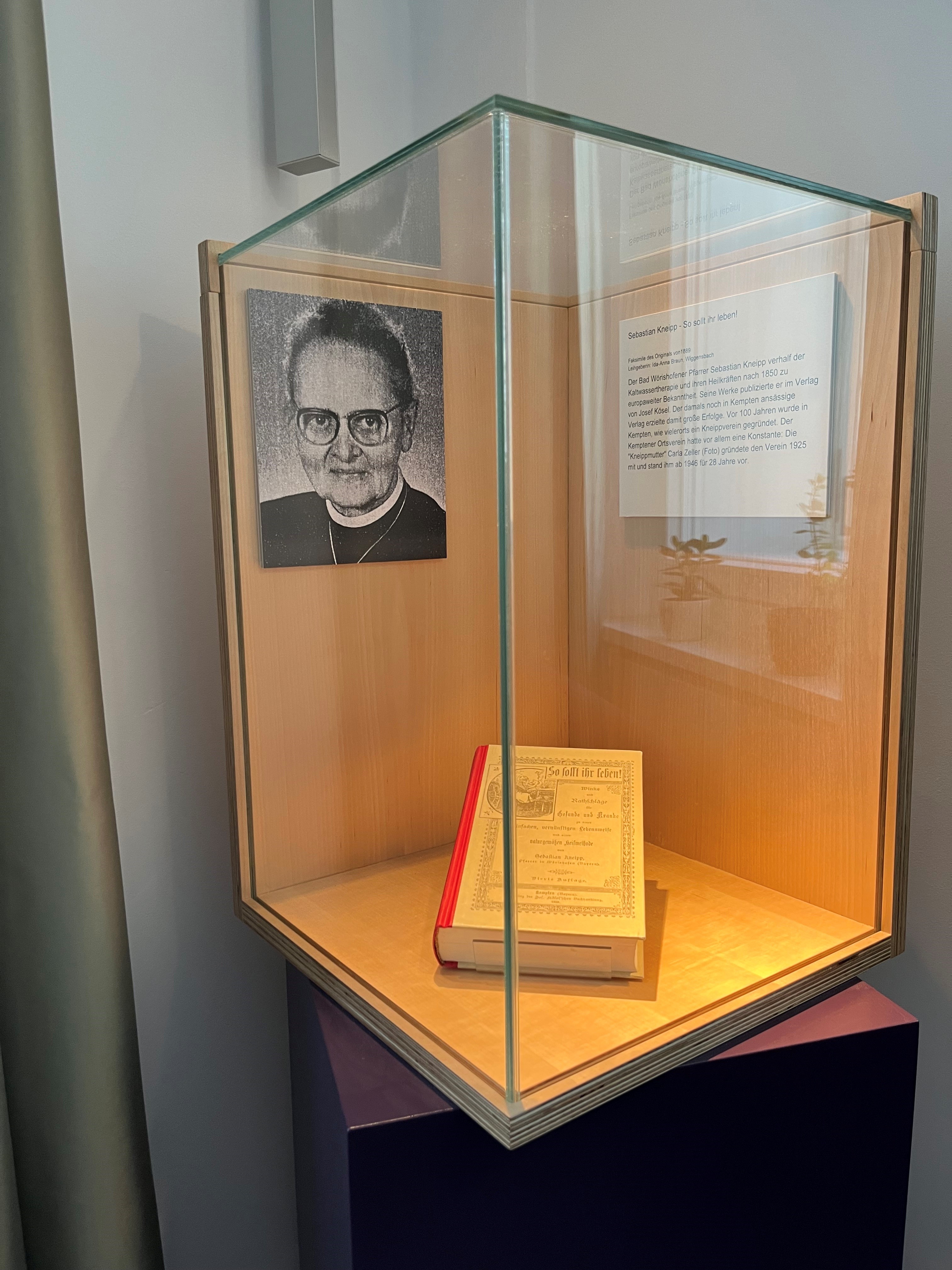 Mit der neuen Serie "Jubiläumsobjekte" entwickelt das Kempten-Museum die Idee des partizipativen Stadtmuseums weiter: Im Salon des Museums präsentieren seit 2024 Kemptener Vereine, Firmen und andere Gruppen Meilensteine ihrer Geschichte vorübergehend in einer Museumsvitrine und erzählen die Geschichte zu dem Objekt. Nach dem Pokal „Spiel ohne Grenzen“ ist nun das Buch „So sollst du leben!“ von Sebastian Kneipp aus dem Besitz der derzeitigen Vorsitzenden des Kneipp-Vereins Kempten Ida-Anna Braun in die Jubiläumsvitrine eingezogen.