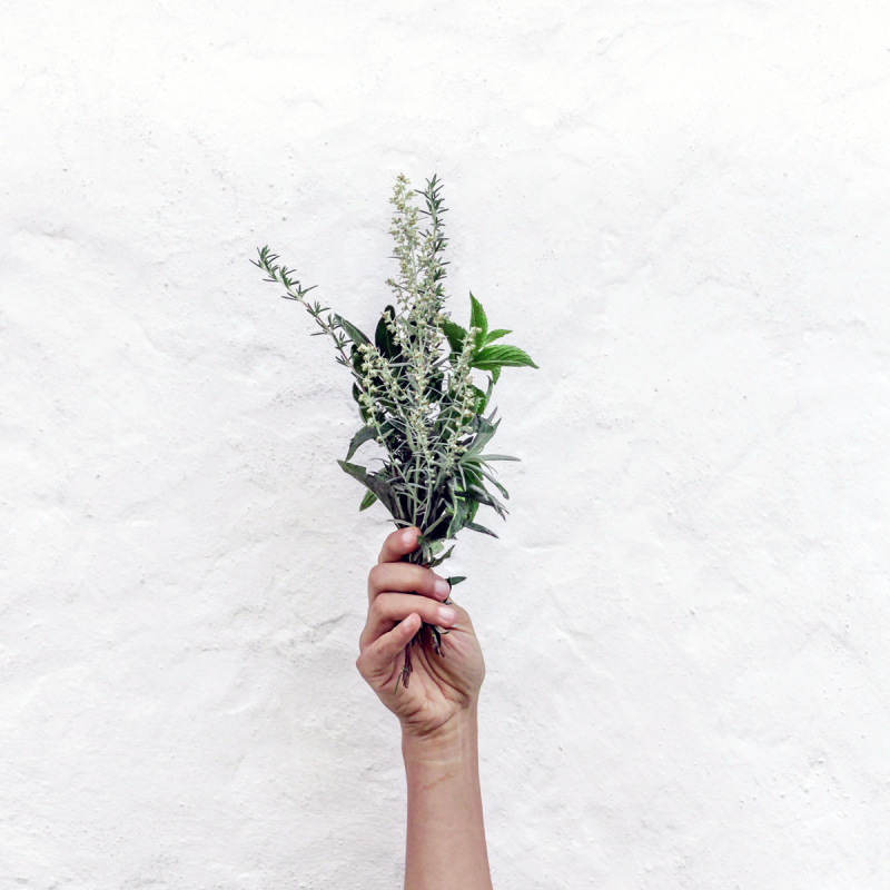 • eine Hand streckt ein Büschel Kräuter in die Luft