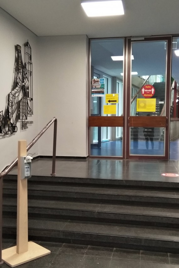 Spender zur Handdesinfektion im Eingangsbereich des Hildegardis-Gymnasiums