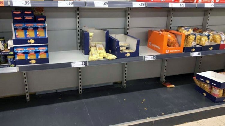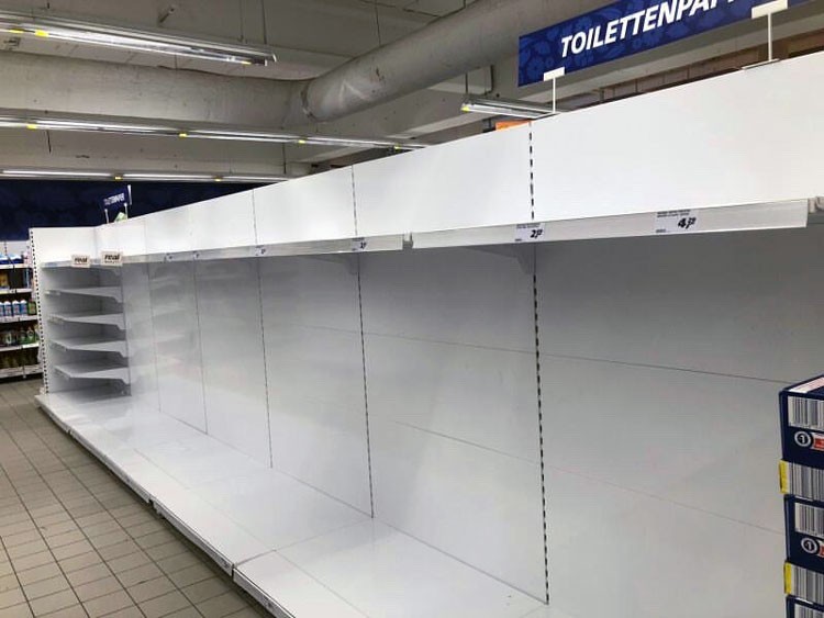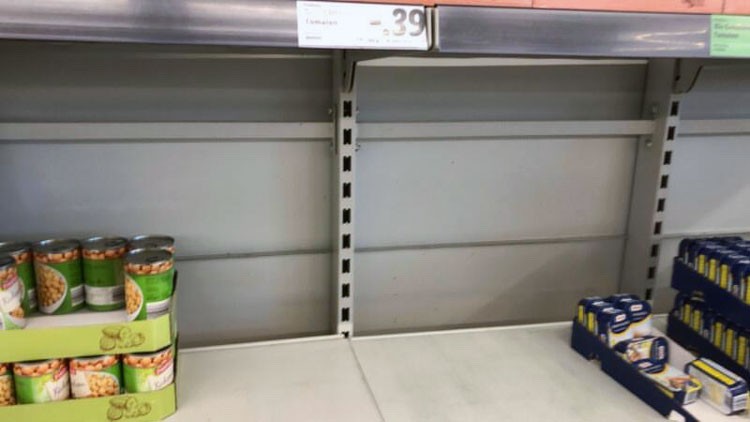 Leere Regale – Nudelregal, Tomatendosenregal und Toilettenpapierregal in Supermärkten in Kempten