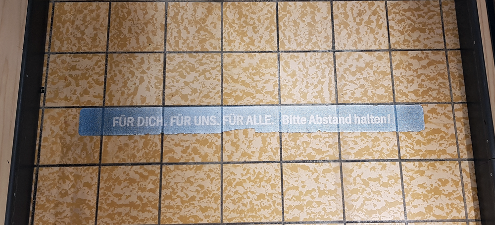Aufkleber auf Fließenboden: Für dich. Für uns. Für alle. Bitte Abstand halten!