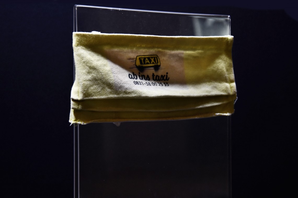 Heute-Objekt 2021: Mundschutz mit Aufschrift „ab ins Taxi“ (Thema Verkehr)