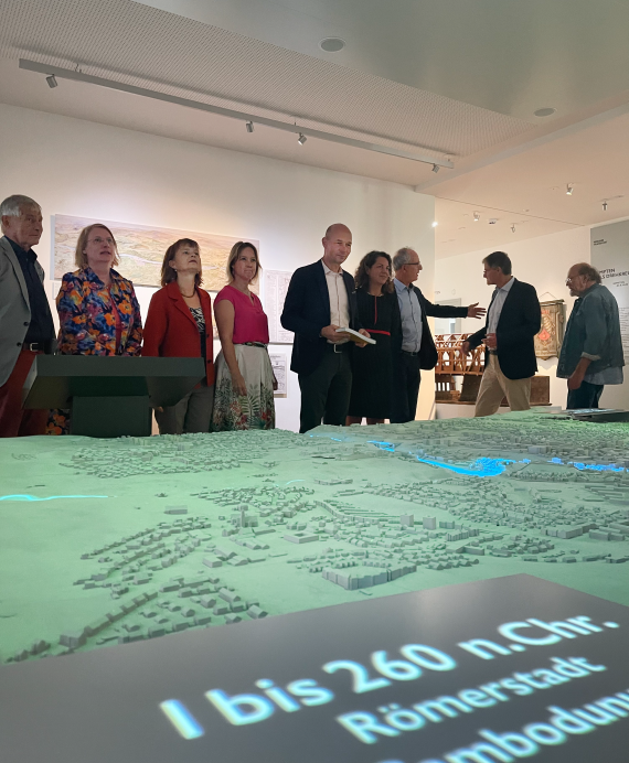 Die Autor:innen der Chronik der Kemptener Geschichte am Stadtmodell im Museum.