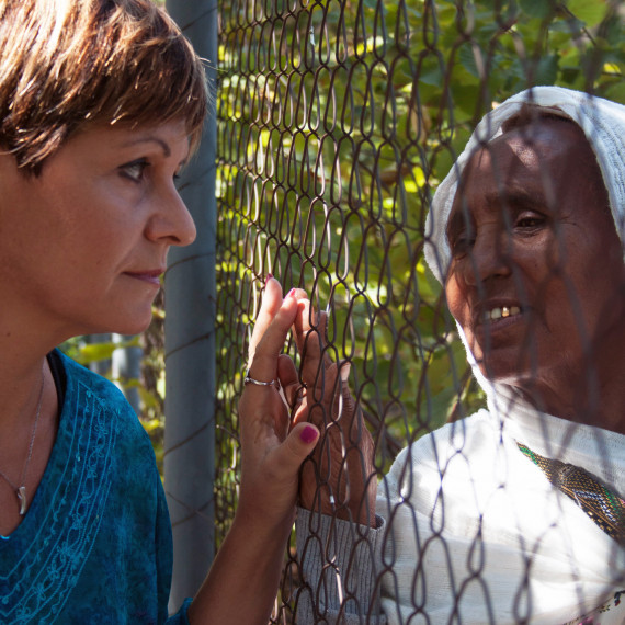 Die Journalistin Olga Kalman am ungarischen Grenzzaun mit einer geflüchteten Frau, © Luca Pungor